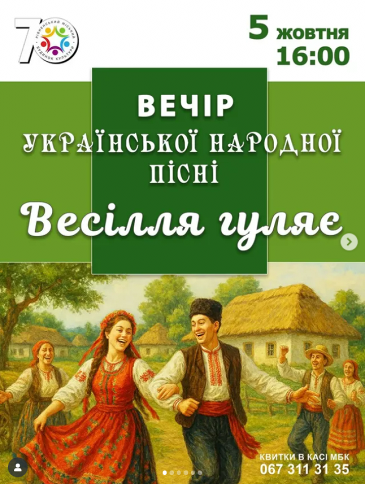 - 5 ЖОВТНЯ - почнемо ми з "Весілля гуляє". Вечір української народної пісні та яскраве театралізоване дійство. Друга серія мелодрами в українському дусі про кохання Соломії та Захара. Глядацька зала. Початок о 16 год