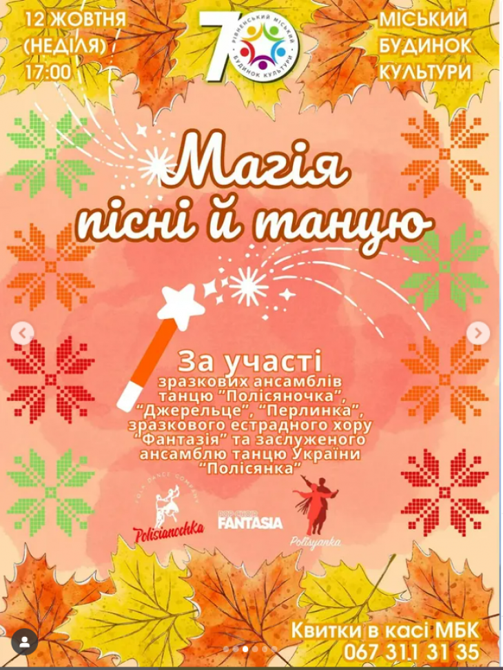 - 12 ЖОВТНЯ - цього ж дня о 17 год вас зачарує "Магія пісні й танцю". Ролі чарівників візьмуть на себе ансамблі "Полісянка", "Полісяночка", "Джерельце", "Перлинка" та хор "Фантазія"