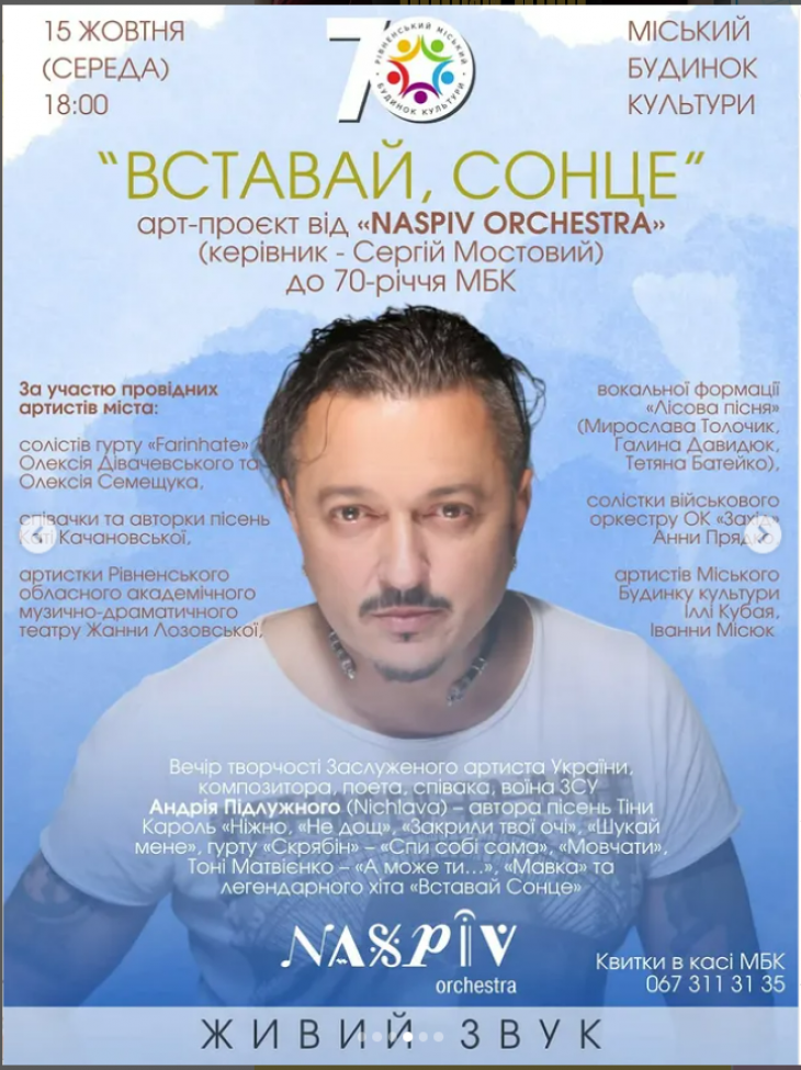 - 15 ЖОВТНЯ - продовжуємо цикл арт-проєктів, присвячених видатним українським музикантам та композиторам. Цього разу у фокусі оркестру "Наспів" та рівненських артистів - творчість Андрія Підлужного. Концерт "Вставай, сонце" розпочнеться о 18 год
