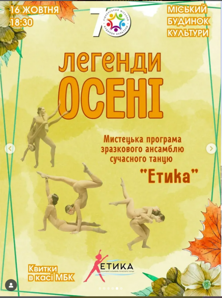 - 16 ЖОВТНЯ - нові "Легенди осені" мовою танцю розповість ансамбль "Етика". Початок о 18:30 год