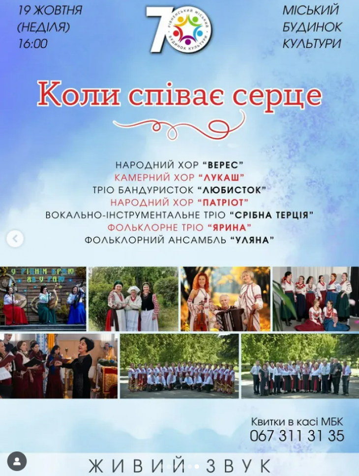 - 19 ЖОВТНЯ - ці колективи співають не просто голосом, вони співають серцем. Хори "Верес", "Лукаш", "Патріот", тріо "Срібна терція", "Любисток", "Ярина" та ансамбль "Уляна" запрошують на свій спільний концерт "Коли співає серце", який почнеться о 16 год