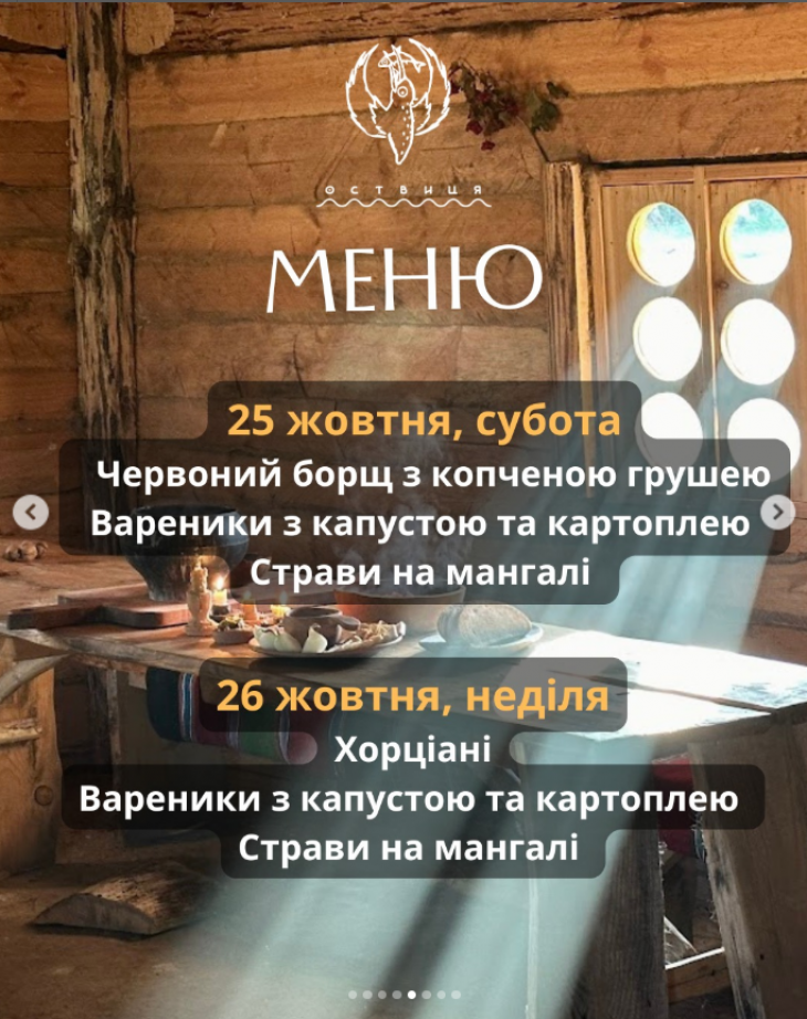 - з 13:00 Червоний борщ з копченою грушею, вареники з картоплею і з капустою, страви з мангалу