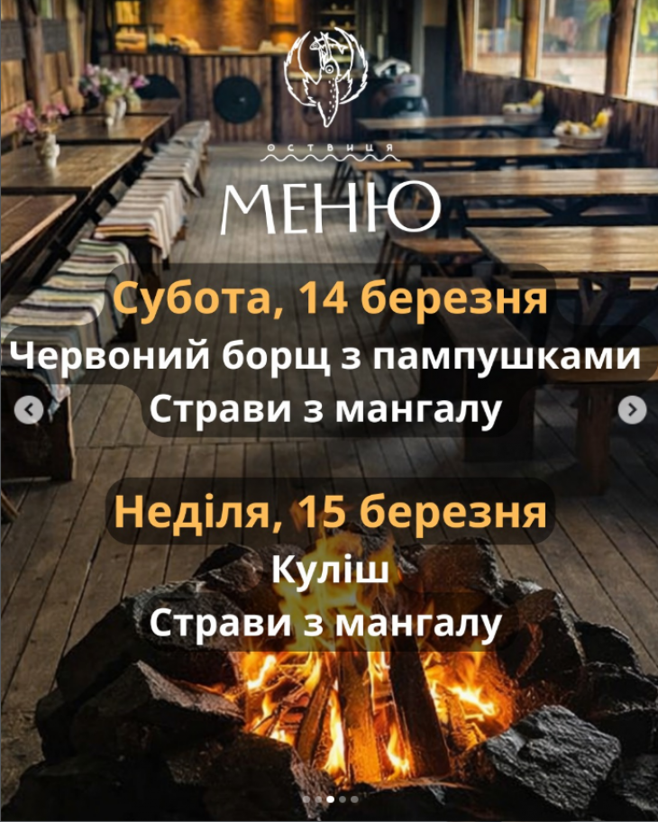 - неділя: куліш, страви на мангалі, гарячі напої та смаколики